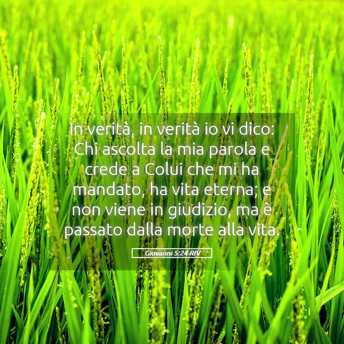 Giovanni 5:24 – “In verità, in verità io vi dico: Chi ascolta la mia parola e crede a colui che mi ha mandato, ha vita eterna e non viene in giudizio, ma è passato dalla morte alla vita.”